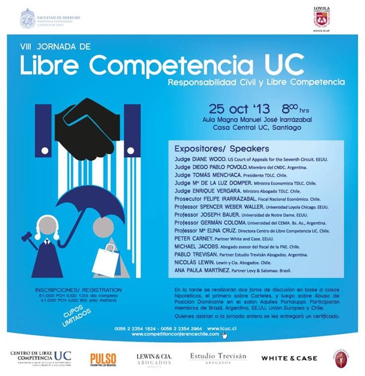 El próximo viernes 25 de octubre se realizará en la sede central de la Pontificia Universidad Católica de Chile un seminario sobre las acciones de indemnización de daños en materia de defensa de la competencia. La «VIII Jornada de Libre Competencia UC» contará con una nómina de lujo que pocas veces se ve en este tipo de eventos de América Latina. No dudo en recomendar a todos los interesados en el derecho de la competencia, que tengan los medios para llegar a Santiago de Chile, que asistan a este seminario co-organizado entre las facultades de derecho de la Pontificia Universidad Católica de Chile y la Universidad de Loyola.