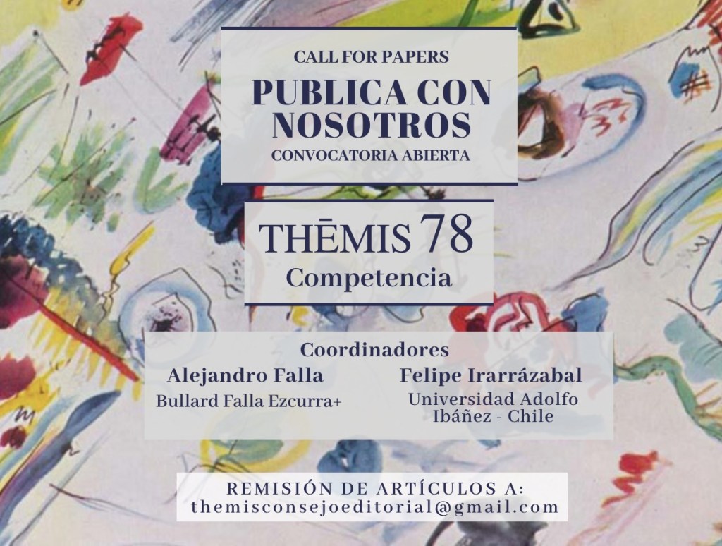 THĒMIS es una revista de Derecho fundada y dirigida por estudiantes de la Pontificia Universidad Católica del Perú (PUCP). Este año THĒMIS decidió que la edición 78 sea un número especial dedicado al Derecho de la Competencia. Para este número, la coordinación general de la Revista estará a cargo de Alejandro Falla (socio fundador de Bullard Falla Ezcurra+) y Felipe Irarrrázabal (director del Centro de Competencia de la Universidad Adolfo Ibáñez), y la recepción de artículos será a través de un Call for Papers, cuya fecha límite es el 18 de junio del 2020.