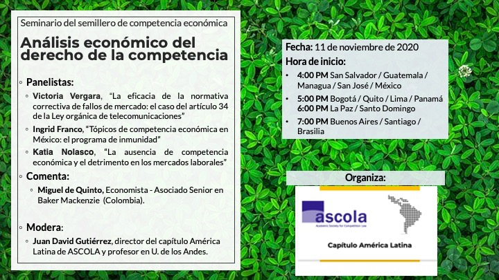 El miércoles 11 de noviembre de 2020 el semillero de competencia económica del capítulo América Latina de ASCOLA organizará su cuarto seminario del año. El seminario tratará sobre tópicos específicos en los cuales se realiza análisis económico del derecho de la competencia.