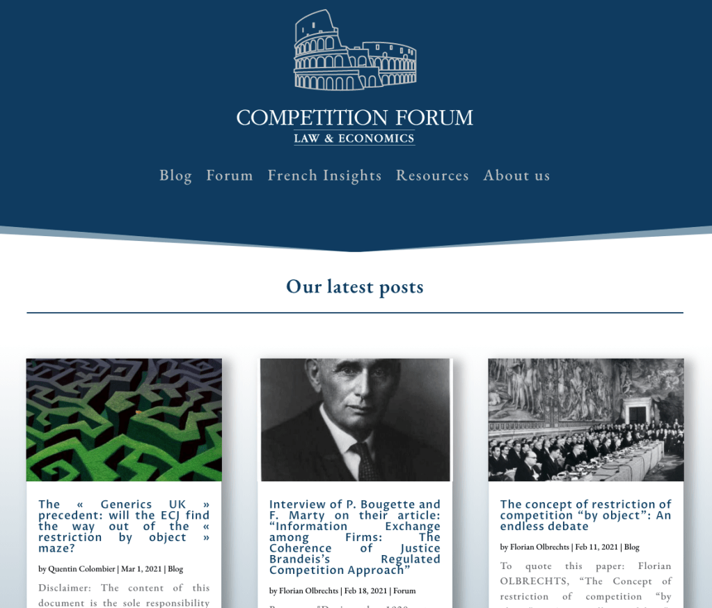 El blog «Competition Forum» es una plataforma académica que tiene como objetivo abrir espacios para académicos en debates actuales sobre derecho de la competencia. Por ejemplo, en el blog han publicado entrevistas con investigadores como Nicolas Petit, Oles Andriychuk, Rupprecht Podszun y Frédéric Marty. El blog también busca que haya más textos en inglés con información y análisis sobre la ley de competencia francesa y sus principales casos (ej. Google y Apple).