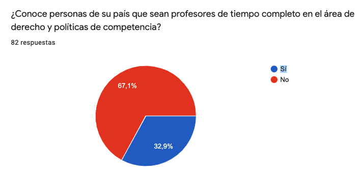 Primero. En América Latina no habría más de una docena de profesores que trabajen tiempo completo en una universidad y que se especialicen en derecho e la competencia. El 67% de los encuestados no conocen personas de su país que sean profesores de tiempo completo en la materia. Esta cifra sería mayor si incluyera a las personas que dijeron conocer personas que son «profesores de tiempo completo» pero que en su respuesta sobre a qué profesores se referían identificaron personas que son «profesores de medio tiempo» o de «hora cátedra».