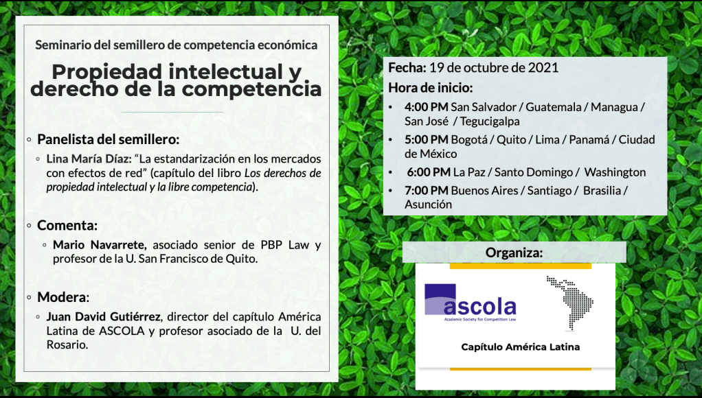 […] El próximo evento del capítulo tendrá lugar el día 19 de octubre de 2021, con motivo del octavo seminario del semillero de competencia económica que tratará sobre “Propiedad Intelectual y Derecho de la Competencia“. […]