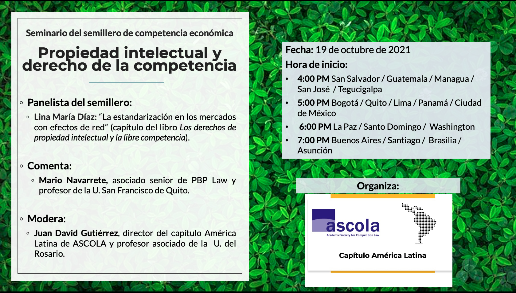 El día martes 19 de octubre, a partir de las 17:00 horas Bogotá, tendrá lugar el tercer seminario de 2021 del semillero del capítulo América Latina de ASCOLA. El tema de la sesión tratará sobre propiedad intelectual y derecho de la competencia y contará con la presentación de Lina María Díaz.