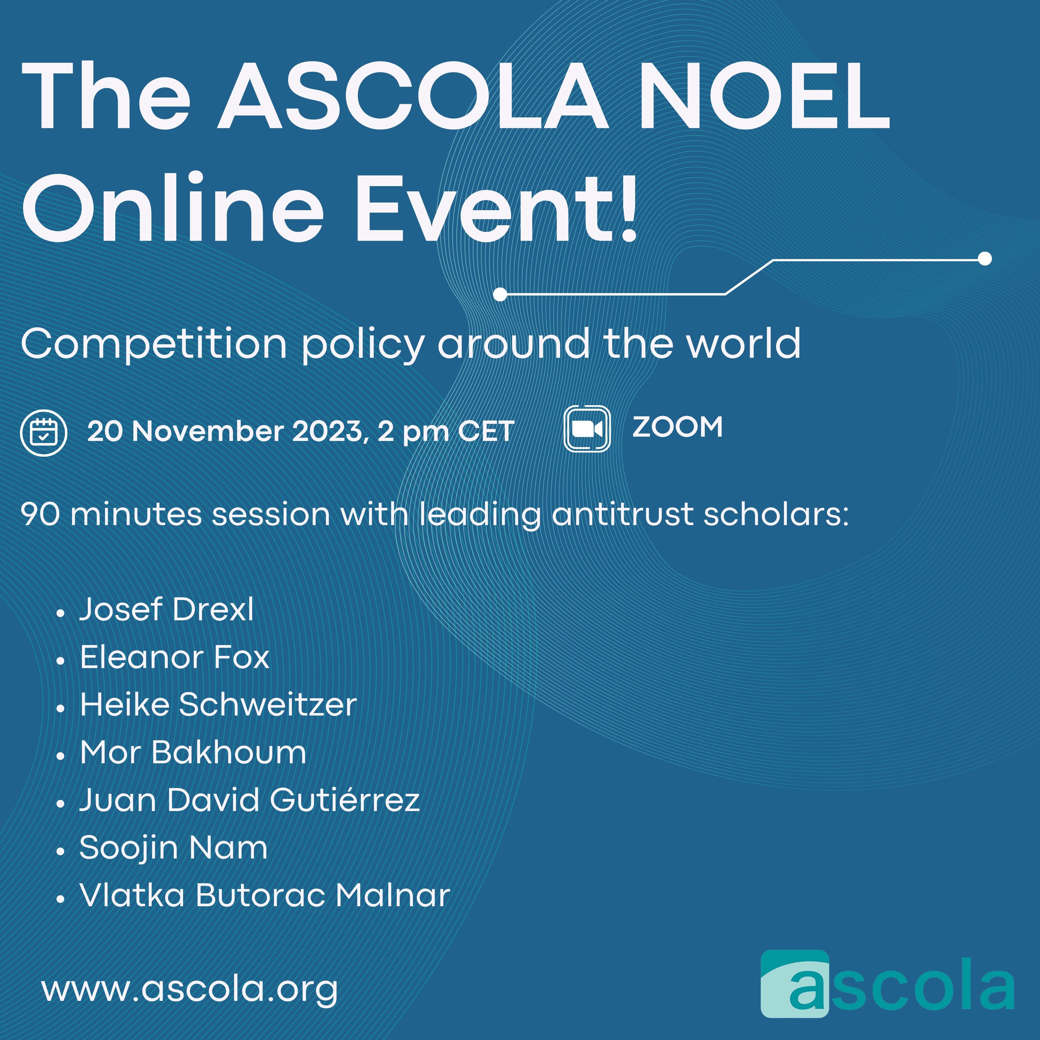 Join us for an online discussion of competition law developments around the world – in a 90 minutes session we will bring together leading antitrust scholars from around the world for an ASCOLA event. The date of the ASCOLA NOEL coincides with the 20th anniversary of founding ASCOLA!