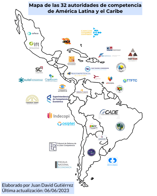 Mapa de las 32 autoridades de la competencia de América Latina y del Caribe
