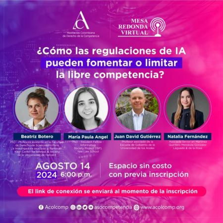 8 agosto, 2024 Juan David Gutiérrez R. Mesa redonda virtual de la ACDC: ¿Cómo las regulaciones de IA pueden fomentar o limitar la libre competencia? (Agosto 14)
