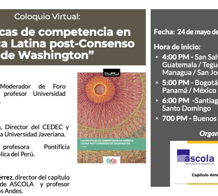20 abril, 2021 Juan David Gutiérrez R. “Políticas de competencia en América Latina post-Consenso de Washington” | Sexto coloquio virtual del capítulo América Latina de ASCOLA (24 de mayo)